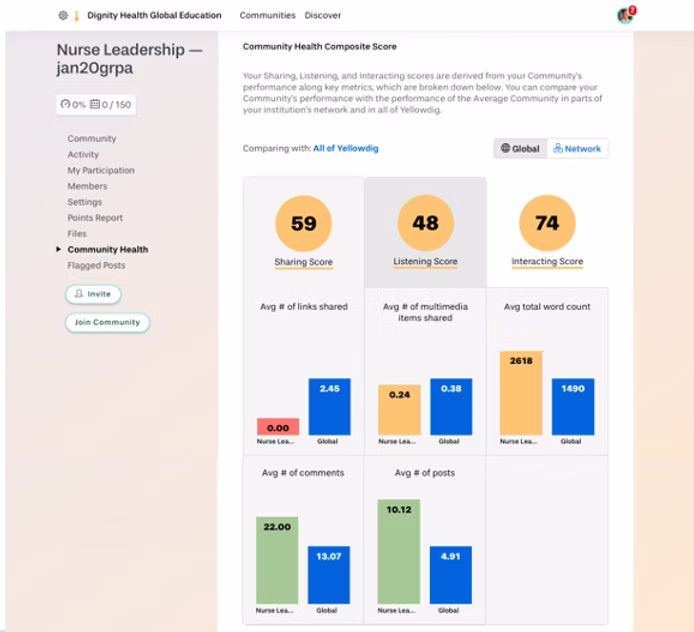 Stakeholders can compare the health of their Yellowdig programs against the success of all Yellowdig users.