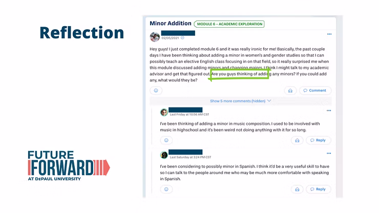 The other thing that Yellowdig was able to help with for the Future Forward Program was the peer-to-peer reflection. It seemed that over time students normalized the uncertainty around career paths by posting reflection posts. As you can see below, the student asks “Are you guys thinking of adding any minors?”