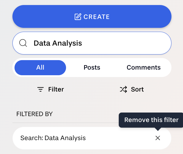 Search for Content by keyword. This will return all Posts and Comments where the keyword appears in the title or body. To clear the search filter, click the x next to the corresponding filter box.