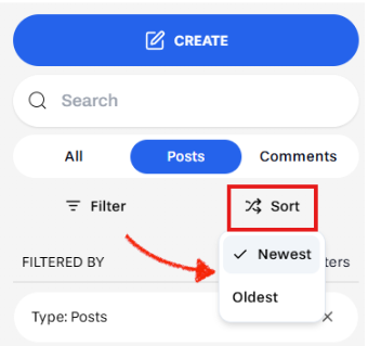 Organize your Feed By Recent Posts or Comments, which sorts by Post and Comment based on the date of posting; By Recent Posts, which sorts by Post based on the date of posting; and By Active Posts, which sorts by how many Comments and Reactions a Post has received to date. Regardless of which sorting option you choose, Posts that are currently Pinned to Top will always be at the top of your Feed.