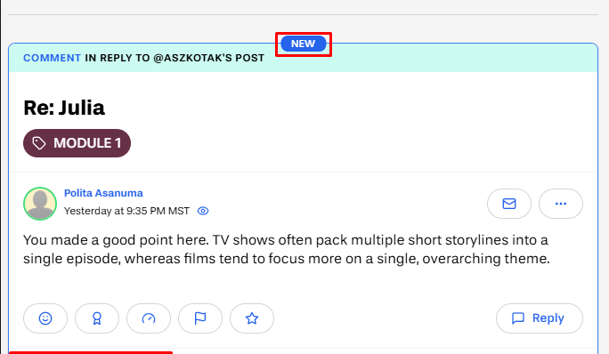 Note: Simply hovering over or reading a student’s post or comment does not mark it as “Read”. This action only removes the “New” status indicator.